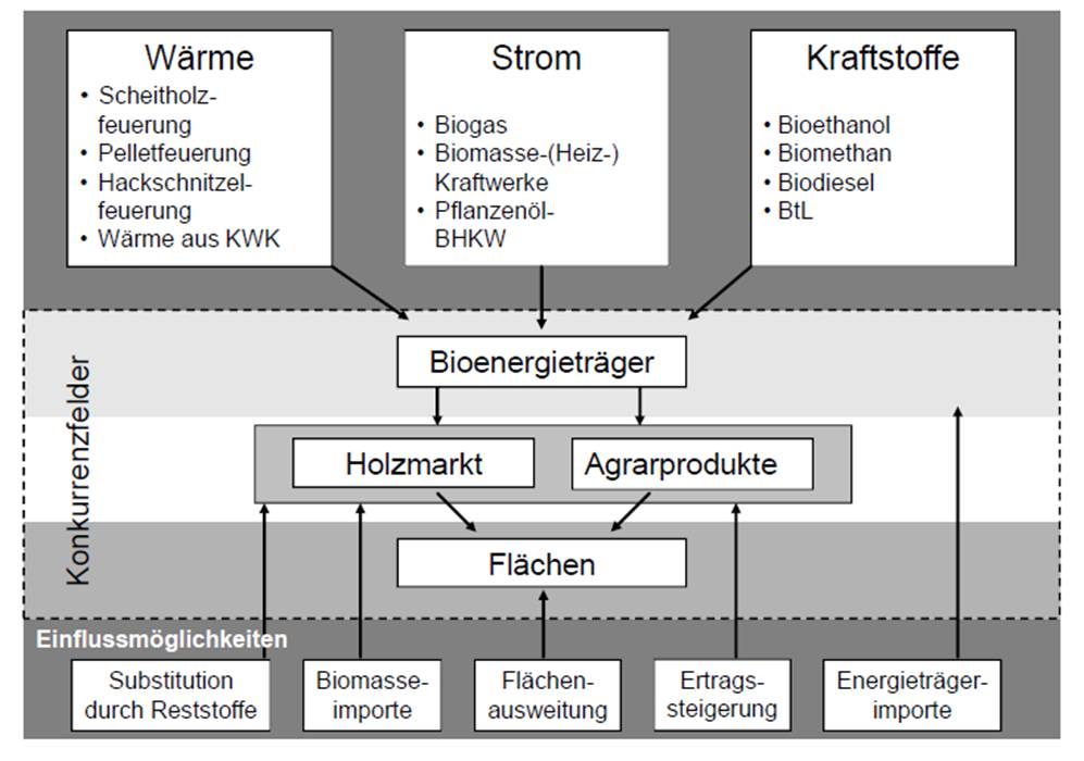 Nutzungsfelder der Bioenergie und mögliche Konkurrenzfelder. Quelle: DBFZ 2011.